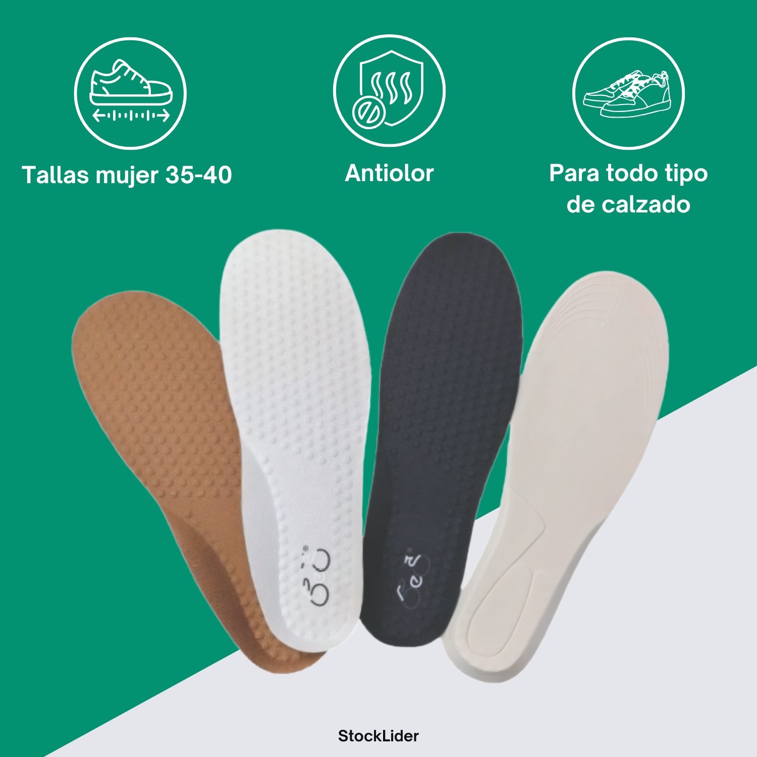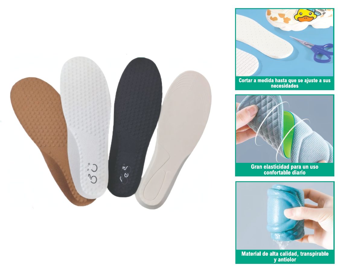 Fabricadas con material de alta calidad, flexible y transpirable, estas plantillas ayudan a mantener los pies frescos y secos durante todo el día. La textura interior es suave al tacto, proporcionando una sensación agradable y reduciendo el cansancio tras largas jornadas de pie.