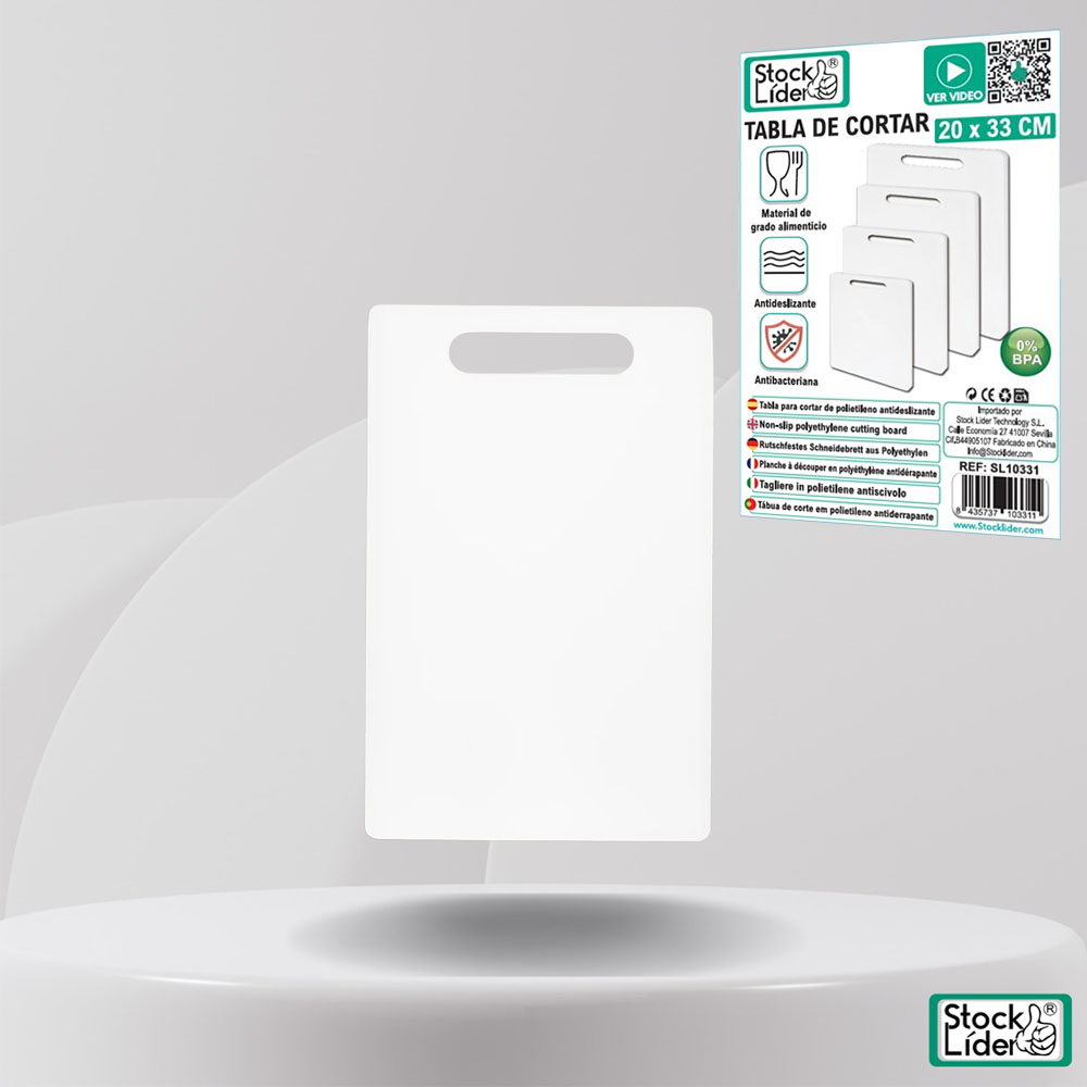 Tabla de polietileno antibacteriano y libre de BPA apta para cortar todo tipo de alimentos como verduras en crudo y carnes y pescados. Material con textura antideslizante para evitar accidentes. Tablas de 17 x 27, 20 x 33 x 1; 23,5 x 37,5 x 1 y 25,5 x 40,5 x1 cm. Grosor que evita la curvatura de la tabla.