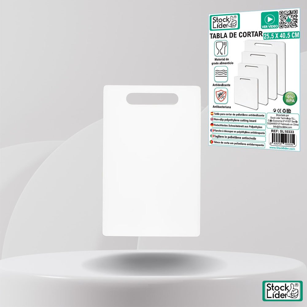 Tabla de polietileno antibacteriano y libre de BPA apta para cortar todo tipo de alimentos como verduras en crudo y carnes y pescados. Material con textura antideslizante para evitar accidentes. Tablas de 17 x 27, 20 x 33 x 1; 23,5 x 37,5 x 1 y 25,5 x 40,5 x1 cm. Grosor que evita la curvatura de la tabla.