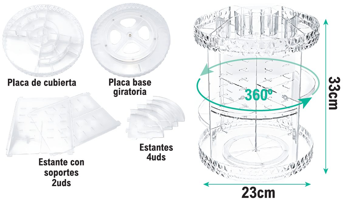 Transforma tu tocador con este práctico organizador de maquillaje giratorio de gran capacidad. Gracias a su diseño elegante y estructura transparente, podrás mantener todos tus productos cosméticos a la vista, perfectamente ordenados y listos para usar.