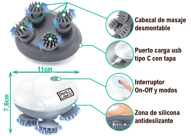 El Masajeador Portátil StockLíder está diseñado para ofrecerte una experiencia de relajación completa en cualquier momento y lugar. Con sus cabezas de masaje de silicona suave y desmontables, cuida tanto tu cuero cabelludo como el pelo de tus mascotas, proporcionando un masaje agradable, seguro y eficaz.