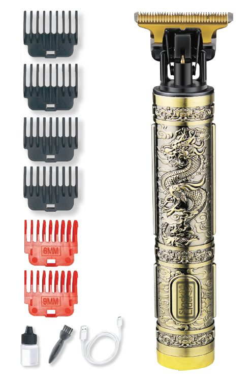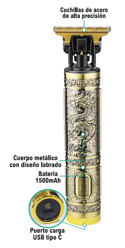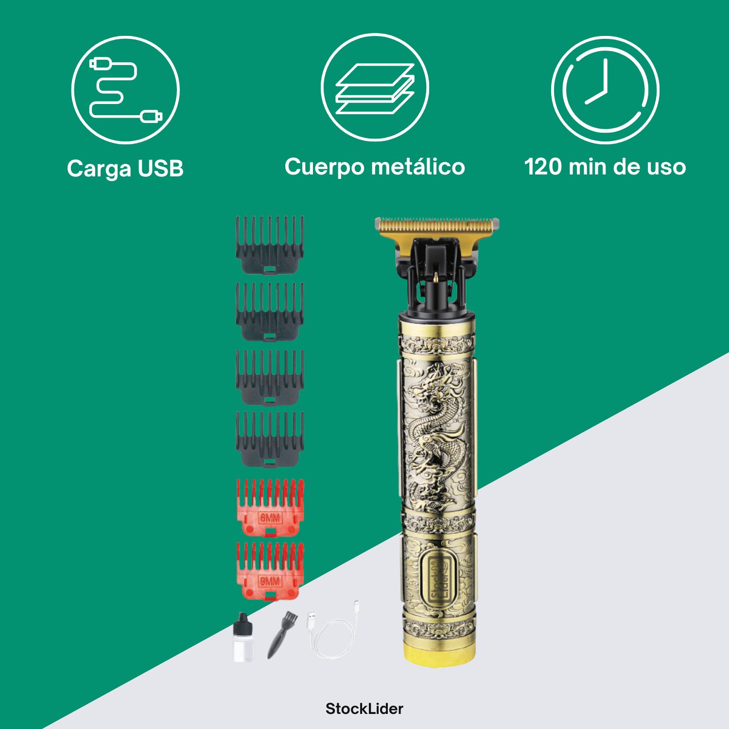 La Maquinilla Cortapelo Diseño Dragón es una herramienta profesional que combina potencia, precisión y estilo en un diseño único. Su cuerpo metálico con grabados en acabado dorado aporta un toque elegante y robusto, inspirado en la fuerza y majestuosidad del dragón.