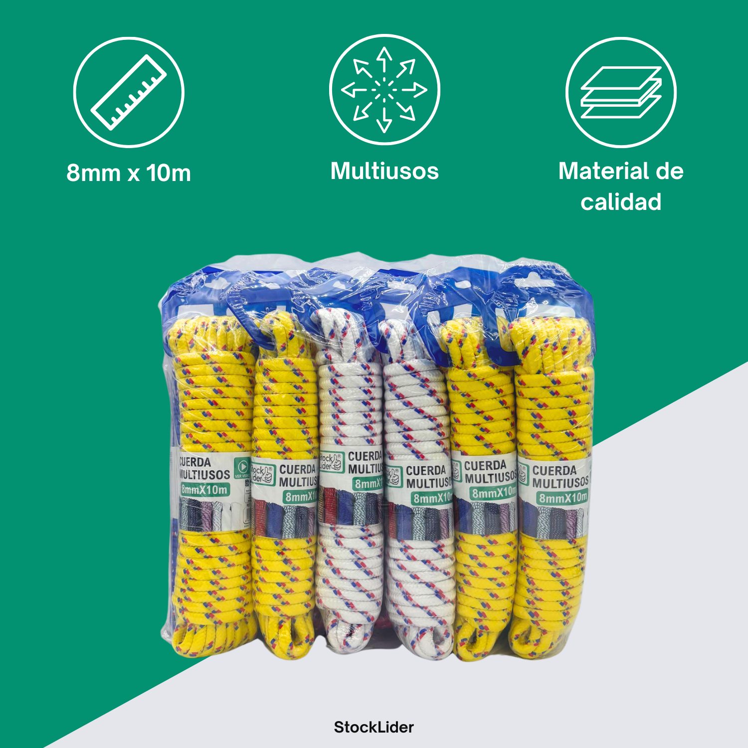 La Cuerda Multiusos StockLíder es la solución práctica y resistente para todo tipo de tareas en casa, jardín, bricolaje o actividades al aire libre. Disponible en diferentes grosores y longitudes, se adapta a tus necesidades con total versatilidad: 4mm x 20m, 6mm x 10m, 8mm x 10m y 5.5mm x 10m.