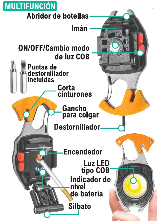 Funciones: Luz LED, abridor de botellas, corta cinturones, destornillador, encendedor, imán, silbato, gancho para colgar