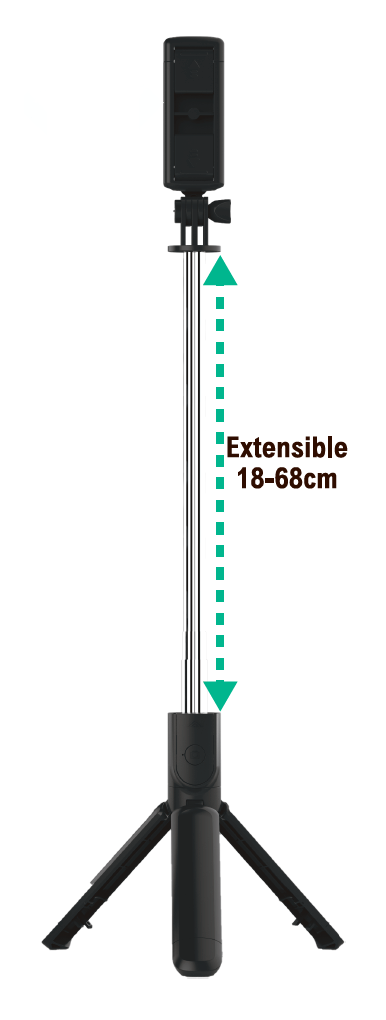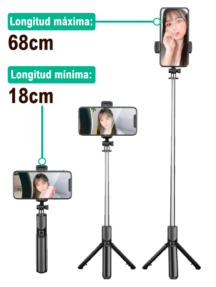 Gracias a su rotación libre de 360° y al ajuste de ángulo, podrás grabar o fotografiar en posición horizontal o vertical con total precisión. Su tubo extensible permite regular la altura desde 18 cm hasta 68 cm, ofreciendo máxima versatilidad tanto en planos cortos como abiertos.