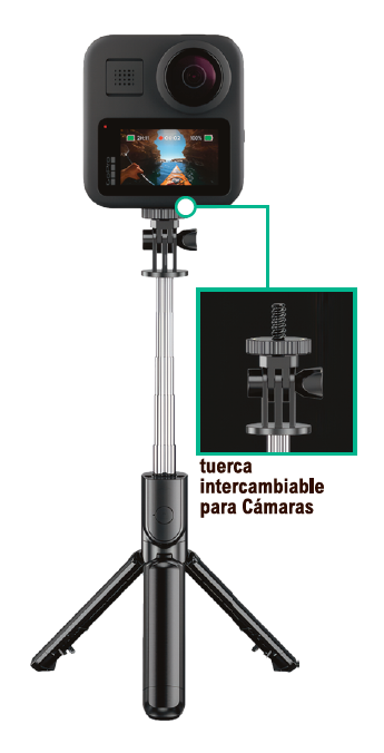Incluye un mando inalámbrico extraíble, compatible con iOS y Android, que permite controlar la cámara a distancia sin cables. Fabricado con estructura de aluminio, incorpora trípode estable, base con silicona antideslizante y soporte seguro para el móvil, garantizando firmeza y comodidad en cada uso.