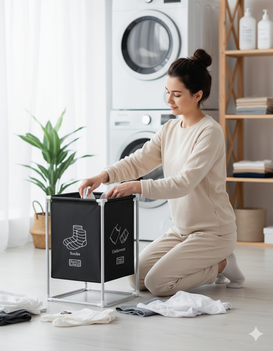El cesto de lavandería es la solución perfecta para mantener la ropa organizada de forma práctica y elegante en cualquier estancia del hogar. Su diseño moderno y minimalista encaja fácilmente en dormitorios, lavaderos, cuartos de baño o habitaciones infantiles, aportando orden y funcionalidad sin ocupar demasiado espacio.
